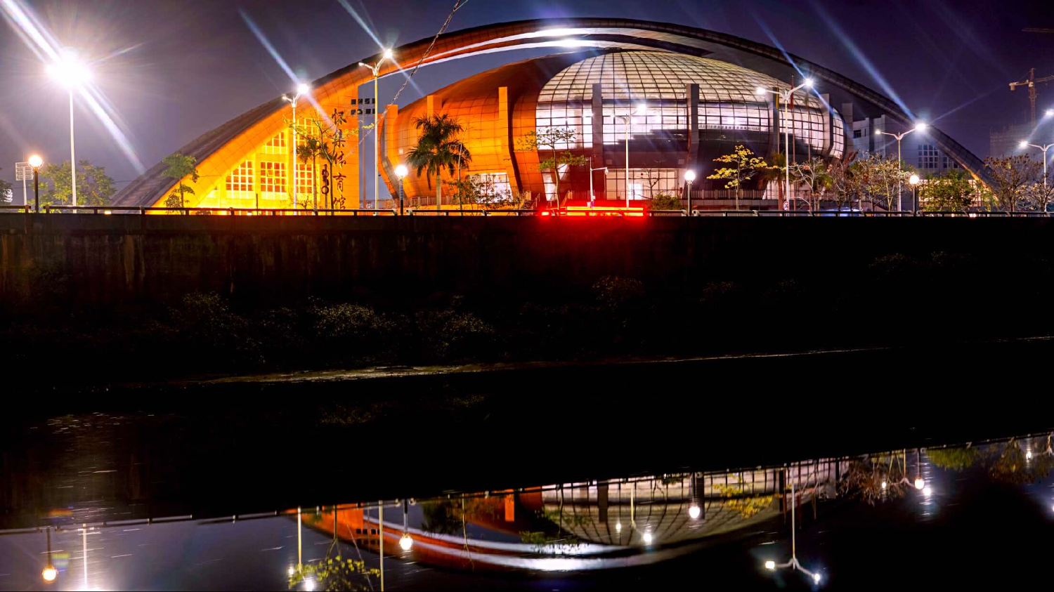 夜色下的怀集体育馆水光相映,别有一番韵味。(摄影:范振朋)